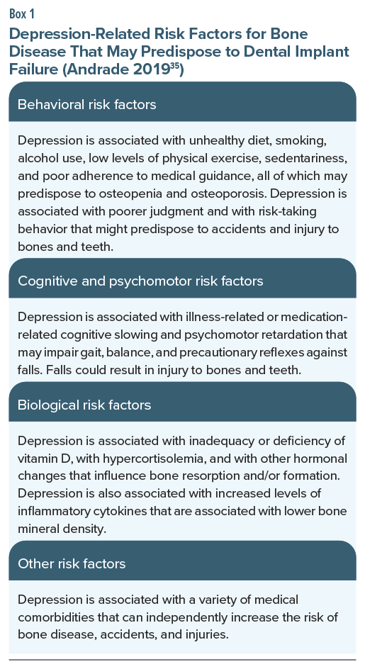 If the association between antidepressant use and dental implant failure is not cause and effect, what explains the association? One explanation is that antidepressant use is a marker for other risk factors for implant failure; examples of such risk factors are alcohol use and frailty.7 Another explanation is that antidepressants are most commonly used to treat depression, and depression is itself associated with a large number of risk factors for bone disease and hence dental implant failure (Box 1).35