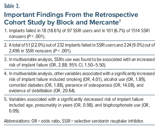 Important findings from the study are presented in Table 3. In summary, the implant failure rate in SSRI users vs nonusers was 18.6% vs 6.7% at the patient level and 22.0% vs 9.0% at the implant level. SSRI use was associated with nearly trebled odds of implant failure.
