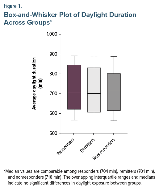 Results: The median average duration of daylight in the responder group (n=99) was 704 minutes. The median average duration of daylight in the remitter group (n=62) was 701 minutes, whereas the median average duration of daylight in nonresponders (n=52) was 718 minutes. The Mann-Whitney U test showed no statistical difference in the average daylight duration between the responder and nonresponder groups. Similarly, there was no statistical difference in the average daylight duration between the remitter and nonresponder groups.