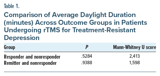 To Cite: Mania I, Kapoor A, Alavidze M, et al. Effect of daylight duration on outcomes of repetitive transcranial magnetic stimulation in treatment-resistant depression. Prim Care Companion CNS Disord 2026;28(1):25m04079.