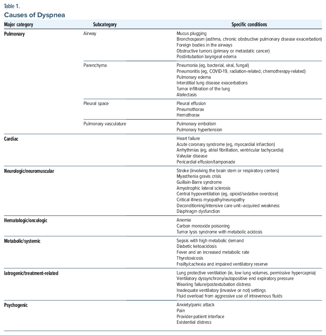 Many conditions (eg, pulmonary, cardiac, neuromuscular, hematologic/oncologic, metabolic, systemic) can contribute to, or elicit, dyspnea. However, even when underlying etiologies are maximally addressed, patients can experience persistent respiratory-derived brain suffering (mental distress related to physiologic or perceived respiratory abnormalities),8 and a multimodal approach is vital to address and reduce suffering (see Table 1 for a detailed list of etiologies for dyspnea).