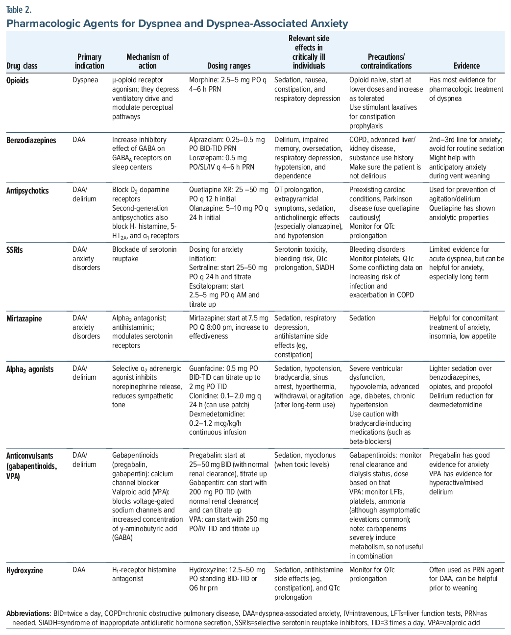 Since dyspnea is distressing and can portend clinical deterioration, it should be managed with disease-modifying interventions (eg, ventilation, transfusion) and medications (eg, diuretics for fluid overload, antibiotics for infection, β agonists and muscarinic antagonists for COPD, or oxygen for hypoxemia) in a timely fashion.40 Of note, increasing oxygen is only indicated and helpful when patients with dyspnea are hypoxemic.7 Decisions about pharmacologic interventions should consider their efficacy, tolerability, and safety41 and may be guided by tools (eg, the Beers Criteria or STOPP) and clinical judgment.42 Nonpharmacologic interventions43 (eg, cognitive-behavioral therapy [CBT], relaxation techniques, handheld fans directed towards the face [that stimulate the trigeminal nerve], music therapy, and empathic reassurance) are other important and low-risk options to consider.43,44 However, despite multiple disease-modifying interventions, many critically ill patients continue to experience dyspnea and DAA. Table 2 summarizes common pharmacologic agents used to treat dyspnea and DAA.