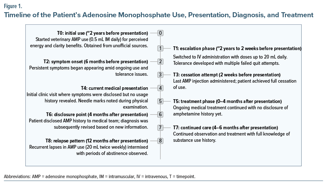 Over the first 4 months of regular follow-up, symptoms fluctuated with brief periods of relief but no overall improvement, despite medication adjustments. This lack of response prompted further inquiry. At the 4-month visit, the patient disclosed a 2-year history of self-administering veterinary-grade AMP, obtained through unofficial sources, believing it enhanced physical vitality and mental clarity. Use began ∼2 years prior with 0.5-mL intramuscular injections daily. Within months, he escalated to intravenous administration, reaching 10 mL per dose, and eventually 20 mL per dose 4–5 times daily—far exceeding any guidelines.1 Postinjection effects included temporary energy, focus, and reduced fatigue, but tolerance developed, requiring higher doses. Failed cessation attempts caused intense restlessness, palpitations, tremors, paranoid ideas, and lethargy. His last injection was 2 weeks before presentation, after which withdrawal symptoms intensified, manifesting as the presenting complaints that had persisted for 6 months.