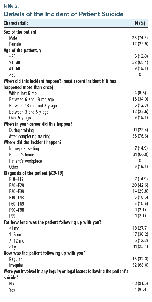 The current study presents a comprehensive look into the impact of patient suicide on MHPs, especially psychiatrists and psychiatry trainees. The demographic profile showed a predominance of female respondents, and psychiatrists formed the largest professional group. The demographics closely align with those observed in the study by Gulfi et al,17 wherein 54.4% of participants were female and the majority were psychiatrists (74.8%).