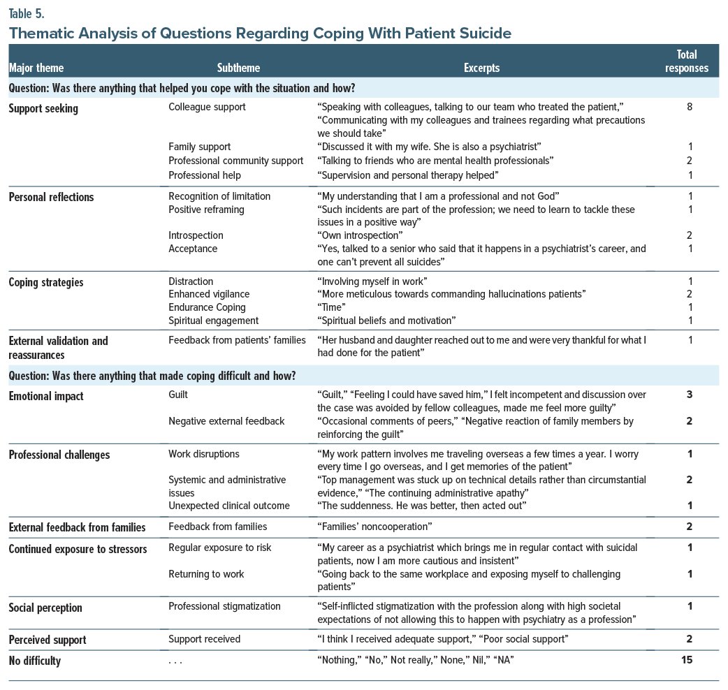 Of the respondents, 52.2% reported that support seeking helped them cope with the situation. Colleague support was emphasized in comments like “Speaking with colleagues, talking to our team who treated the patient” Family support also played a significant role, as one noted, “Discussed it with my wife. She is also a psychiatrist.” Additionally, professional community support (“Talking to friends who are mental health professionals”) and seeking professional help (“Supervision and personal therapy helped”) were valuable. In personal reflections, professionals acknowledged their limitations (“My understanding that I am a professional and not God”) and engaged in positive reframing (“Such incidents are part of the profession, we need to learn to tackle these issues in a positive way.”). Coping strategies varied from distraction (“Involving myself in work”) to spiritual engagement (“Spiritual beliefs and motivation”). External validation, such as feedback from patients’ families (“Her husband and daughter reached out to me and were very thankful for what I had done for the patients.”), also provided comfort (Table 5).