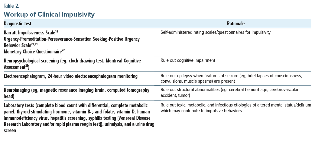 Additional areas of inquiry can include questions regarding complications at birth, developmental delays, autism spectrum disorders (ASDs), and precipitants for impulsivity (eg, the use of medications and substances); see Table 2 for a workup of impulsivity. Recommended tools for assessing impulsivity include the Barratt Impulsiveness Scale,19 Urgency-Premeditation-Perseverance-Sensation Seeking-Positive Urgency Behavior Scale,20,21 Monetary Choice Questionnaire,22 and Montreal Cognitive Assessment,23 as well as relevant neuroimaging and laboratory evaluations (Table 2).