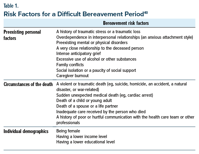 The severity and the expression of grief depend on many factors (eg, one’s relationship with the deceased, the circumstances of the death, prior losses, and the bereaved person’s mental health history).39 Table 1 summarizes the most salient risk factors for bereavement.40