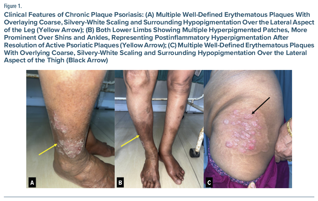 A 71-year-old woman (body mass index = 19.6 kg/m2) with chronic plaque psoriasis for 10 years presented with neuropsychiatric symptoms during acitretin therapy. Her diagnosis of psoriasis was based on clinical features, including multiple well-defined erythematous plaques with silvery-white scales symmetrically over extensor elbows, knees, lumbosacral region, and lower legs (Figure 1A, C). Plaques were indurated, nontender, with postinflammatory hyperpigmentation in healing areas (Figure 1B). Her scalp had mild diffuse scaling, nails had shallow pits without onycholysis or oil-drop sign, and oral/genital mucosa and hair were normal. Grattage test enhanced silvery scaling, candle grease sign revealed a shiny waxy surface, Auspitz sign showed pinpoint bleeding, and Koebner phenomenon was absent.