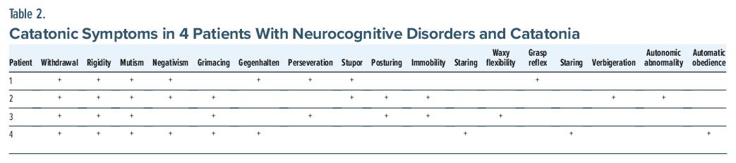 All patients exhibited withdrawal, rigidity, and mutism; 3 also demonstrated negativism and grimacing (Table 2). The average number of catatonic signs over the course of admission was 8.75. Each received lorazepam; 2 required augmentation with memantine alone or with amantadine due to partial response. Although the Bush-Francis Catatonia Rating Scale (BFCRS)3 was not uniformly performed, all patients demonstrated partial clinical improvement. Electroconvulsive therapy (ECT) was unavailable. Most died within 1 month of diagnosis (mean: 19.3 days).
