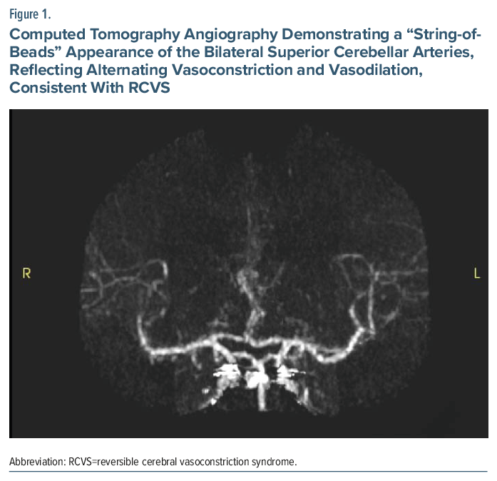Reversible cerebral vasoconstriction syndrome (RCVS) is a rare disorder marked by sudden, severe “thunderclap” headaches and can be accompanied by nausea, vomiting, photophobia, or transient neurologic deficits.1–4 The incidence of this condition is estimated to be 2.7 cases per million adults.2 These headaches are frequently triggered by exertion, sexual activity, or Valsalva maneuvers.4 RCVS involves transient multifocal constriction of cerebral arteries with spontaneous recovery but can still lead to ischemic stroke, subarachnoid hemorrhage, posterior reversible encephalopathy syndrome, or, rarely, death.1,3,5 Although rare, up to 80% of patients have an identifiable trigger, most often the postpartum state or exposure to vasoactive substances with adrenergic or serotonergic activity.3,6 Such agents range from cocaine and other stimulants to prescribed medications including antidepressants.1,3,7 Digital subtraction angiography remains the diagnostic gold standard, though magnetic resonance angiography and computed tomography angiography (CTA) are more commonly implemented to detect the classic “string-of-beads” arterial pattern.4,6,8 Given the widespread use of serotonergic antidepressants, heightened awareness of RCVS risk in psychiatric patients is warranted.9