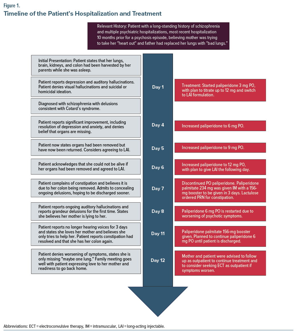 On day 11, she received a 156-mg LAI paliperidone palmitate booster. Following resolution of her constipation, she concluded that she had a colon again and believed most of her organs had been “returned.” Also, her relationship with her mother had normalized, as she expressed love for her mother and appreciation for her care. At discharge, she had denied auditory hallucinations for 4 days, although she still wondered if one lung was missing. She was deemed to pose no risk to herself or others and demonstrated improved insight. The mother was advised to ensure outpatient follow-up to continue treatment and to consider seeking electroconvulsive therapy if the patient’s symptoms worsen, although this was not available at our facility. Figure 1 provides a timeline of the patient’s hospitalization and treatment.