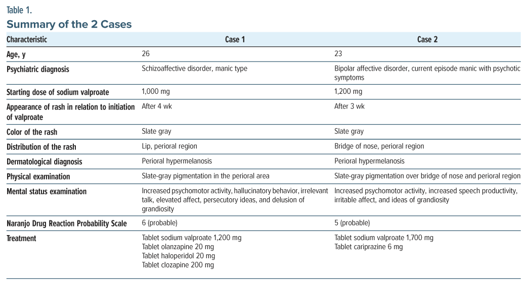 To Cite: Sarkar M, Kamila AS, Mukherjee A, et al. Two cases of sodium valproate and valproic acid–induced hypermelanosis. Prim Care Companion CNS Disord. 2025;27(5):25cr03987.