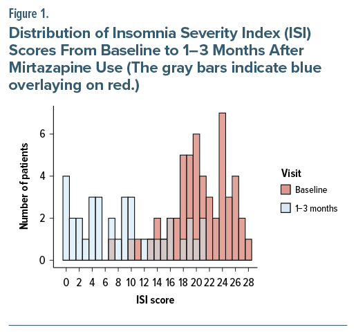 Methods: This retrospective study evaluated data collected from September 5, 2024, to March 7, 2025, from an outpatient setting consisting of veterans with insomnia who were treated with ultra–low-dose mirtazapine. The Insomnia Severity Index (ISI) was administered during the first appointment and at each subsequent visit with the respective psychiatrist to monitor insomnia symptoms. Summary statistics were used to compare ISI scores at baseline and 1–3 months after starting treatment.