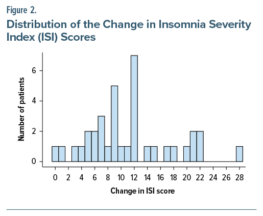 Results: Considering all veterans evaluated (N = 53), 47% showed a meaningful decrease in ISI value (greater than 7 points). Patients who completed treatment showed a constant or decreased ISI score (mean [SD] change: 11.3 [6.46]).