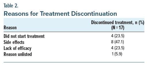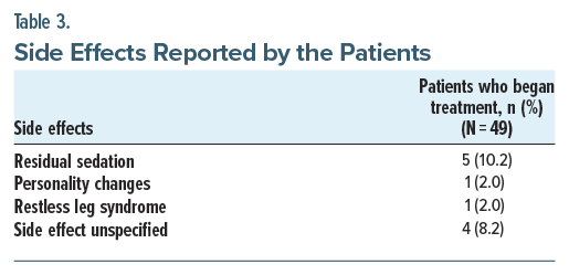 It is important to note that 17 of the 53 veterans evaluated did not complete treatment. Table 2 provides a summary of the discontinuations. Tolerability of mirtazapine 3.75 mg was assessed through the proportion of patients who experienced side effects. Table 3 presents the type of side effect, along with the proportion of those who experienced it. Summary statistics by visit are provided in the Supplementary Material.